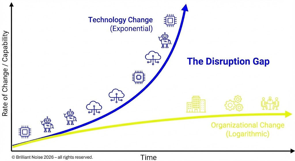 There’s a name for this mismatch. Scott Brinker (via Neil Perkin) calls it Martec’s Law: technology changes exponentially; organisations change logarithmically. Structures, behaviours, culture – they all move slower than the tools.